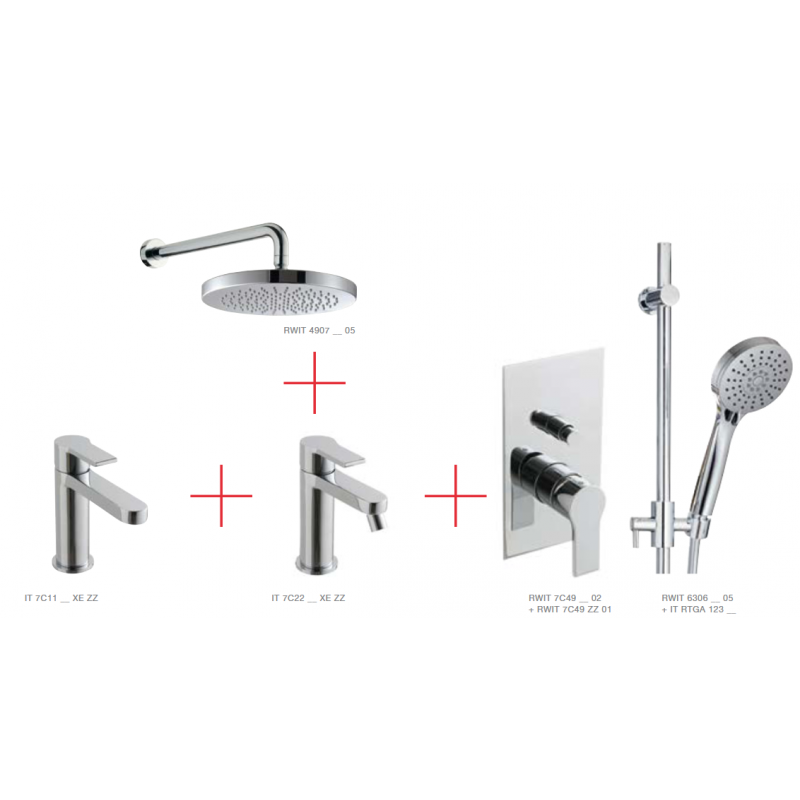 Набор: смеситель для раковины, смеситель для биде, смеситель для душа, штанга с ручным душем и верхний душ на кронштейне из стены Xero+
